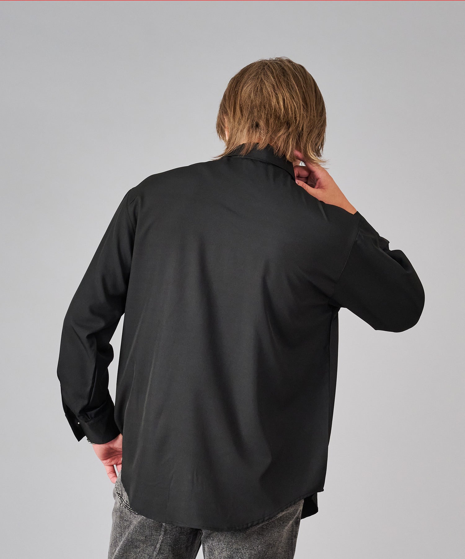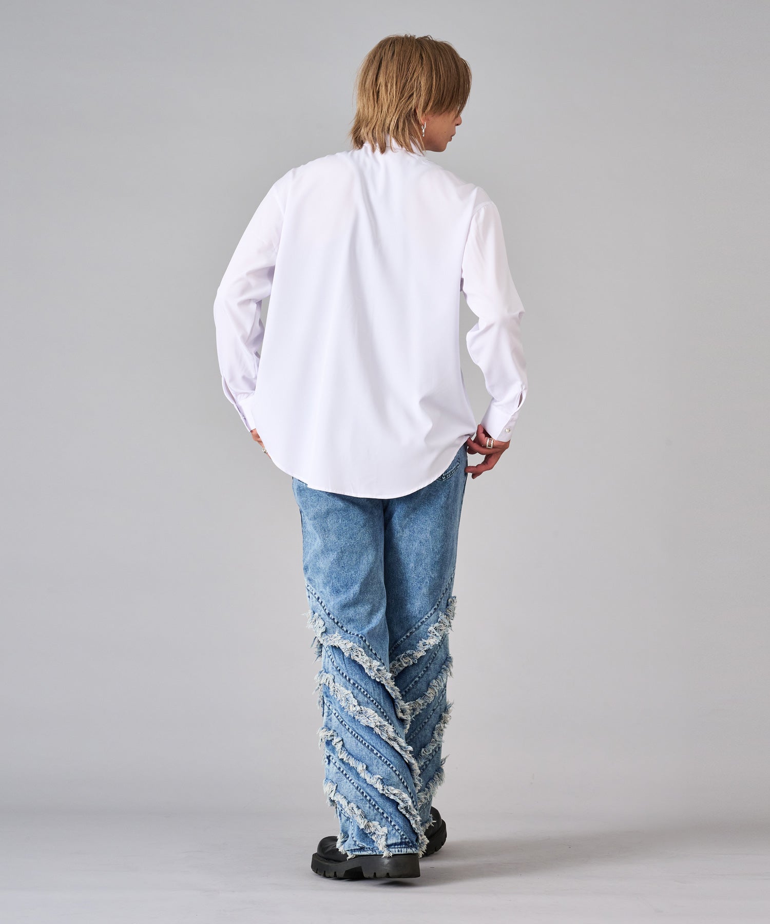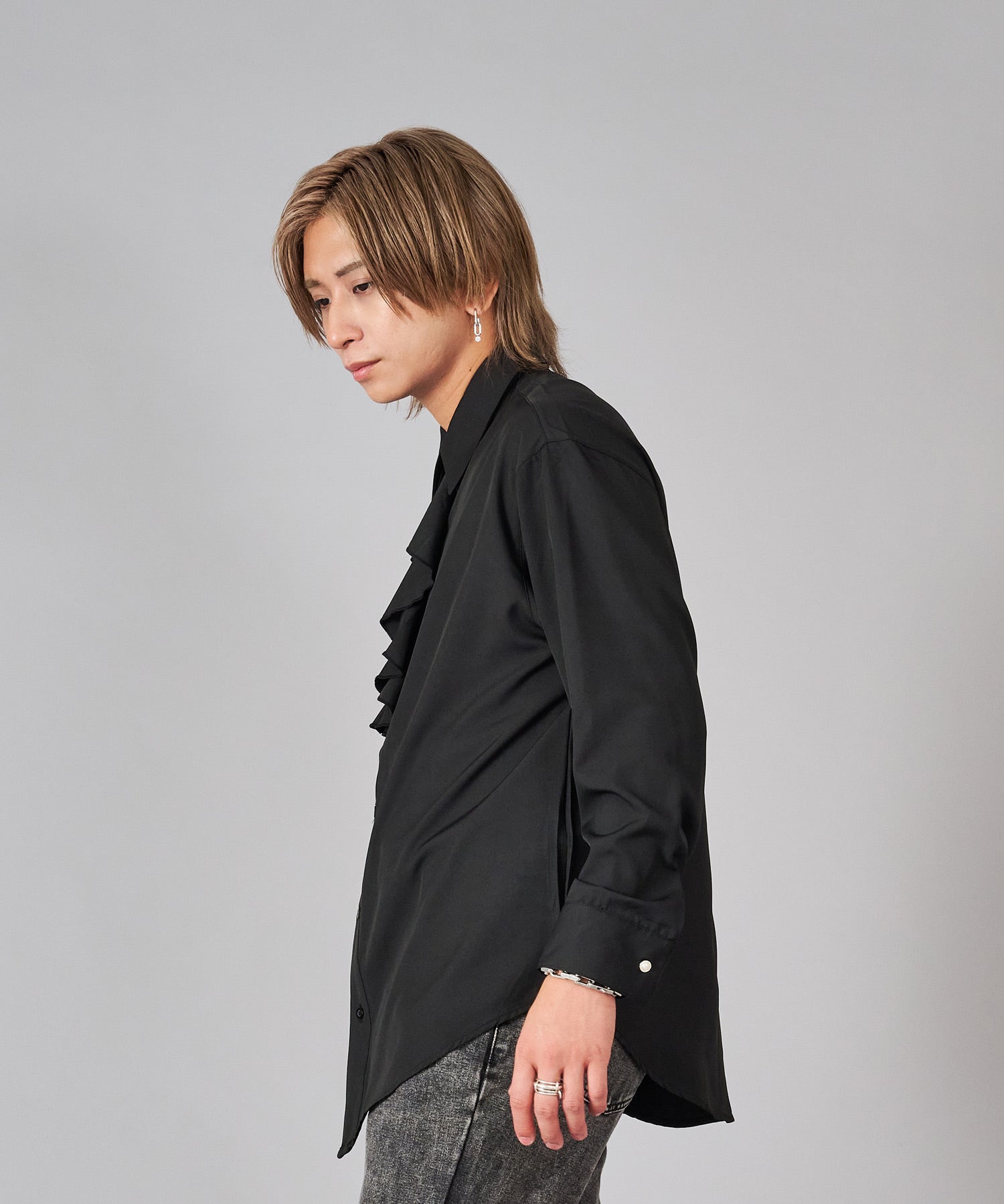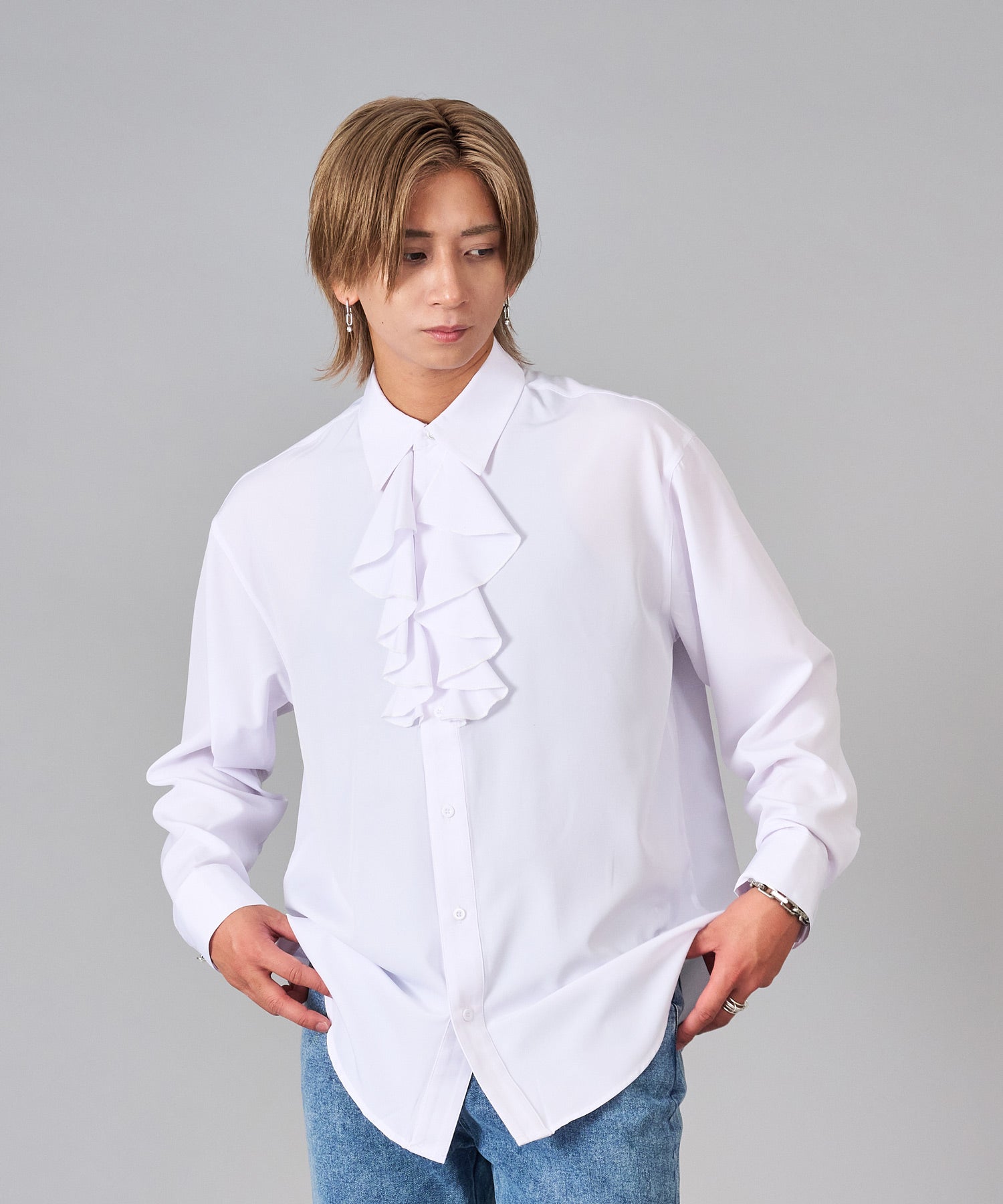 襟のフリルが際立つシャツ