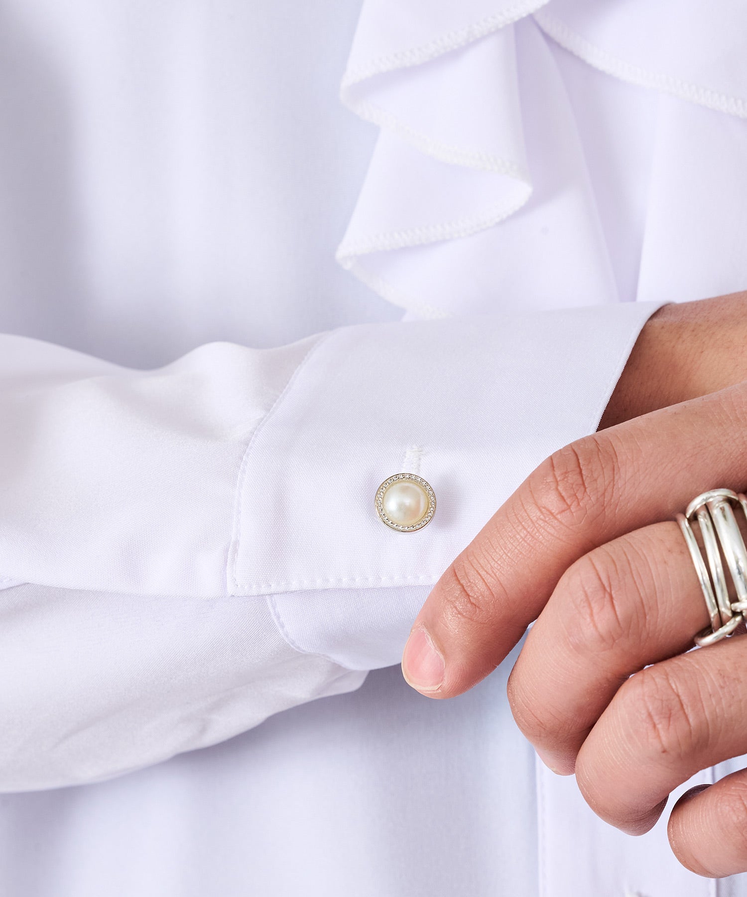 フリルのデザインが、トレンドのクラシカルでエレガントを象徴。第一釦と袖の釦は、ジュエリー調の飾り釦を採用しエレガントさを強調している。