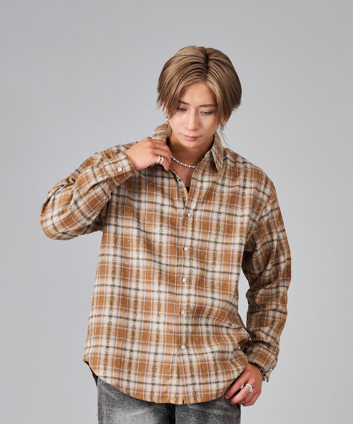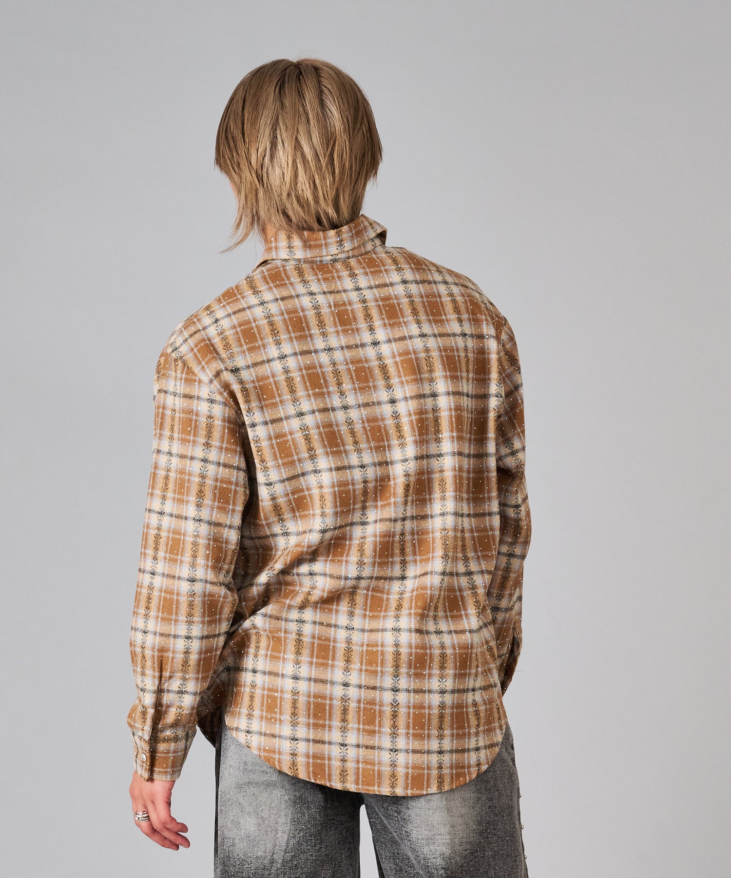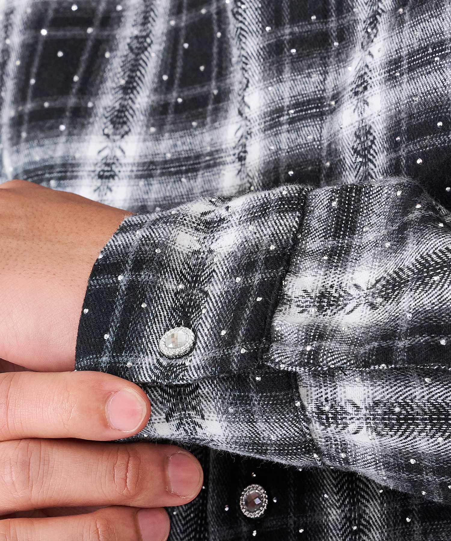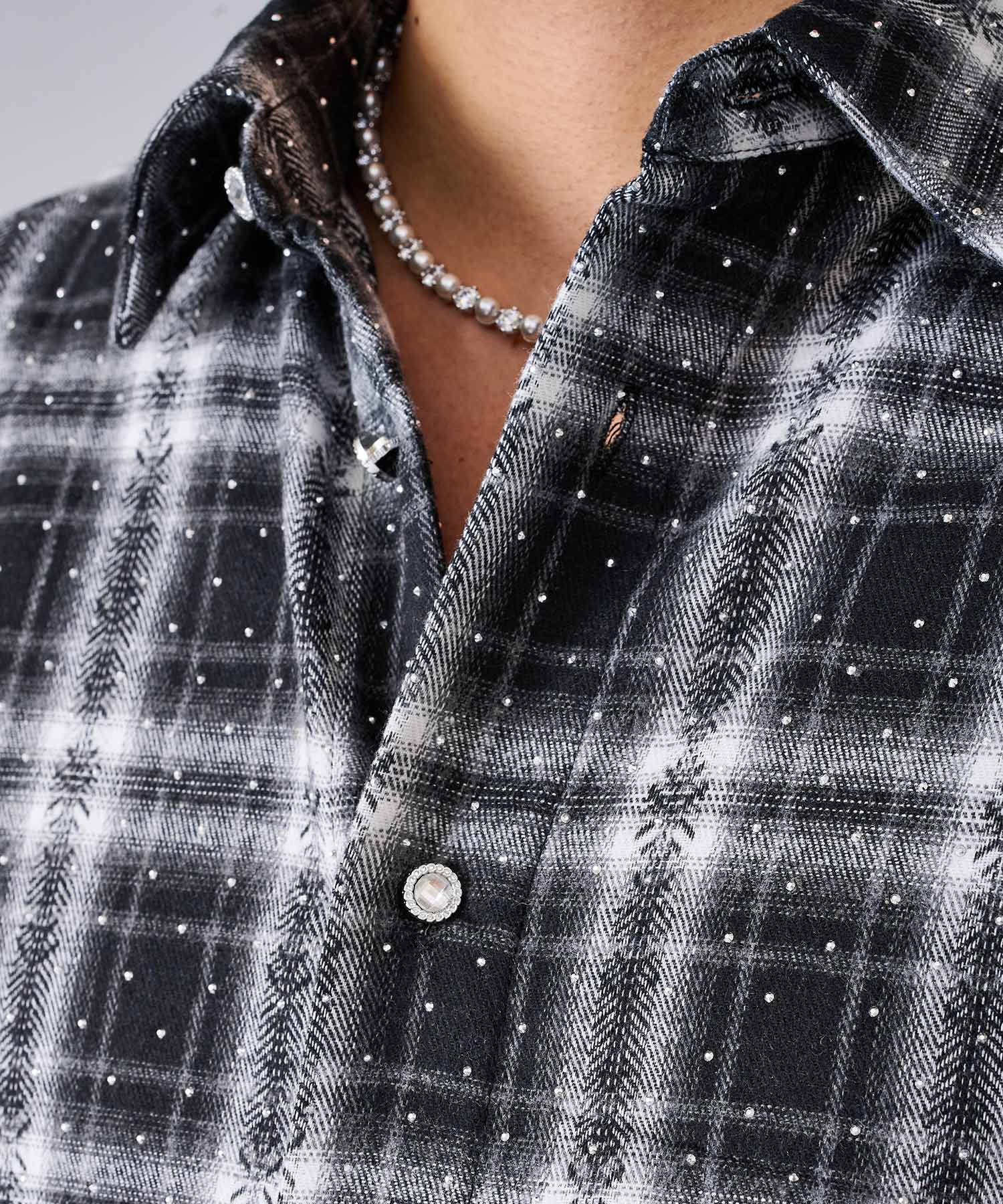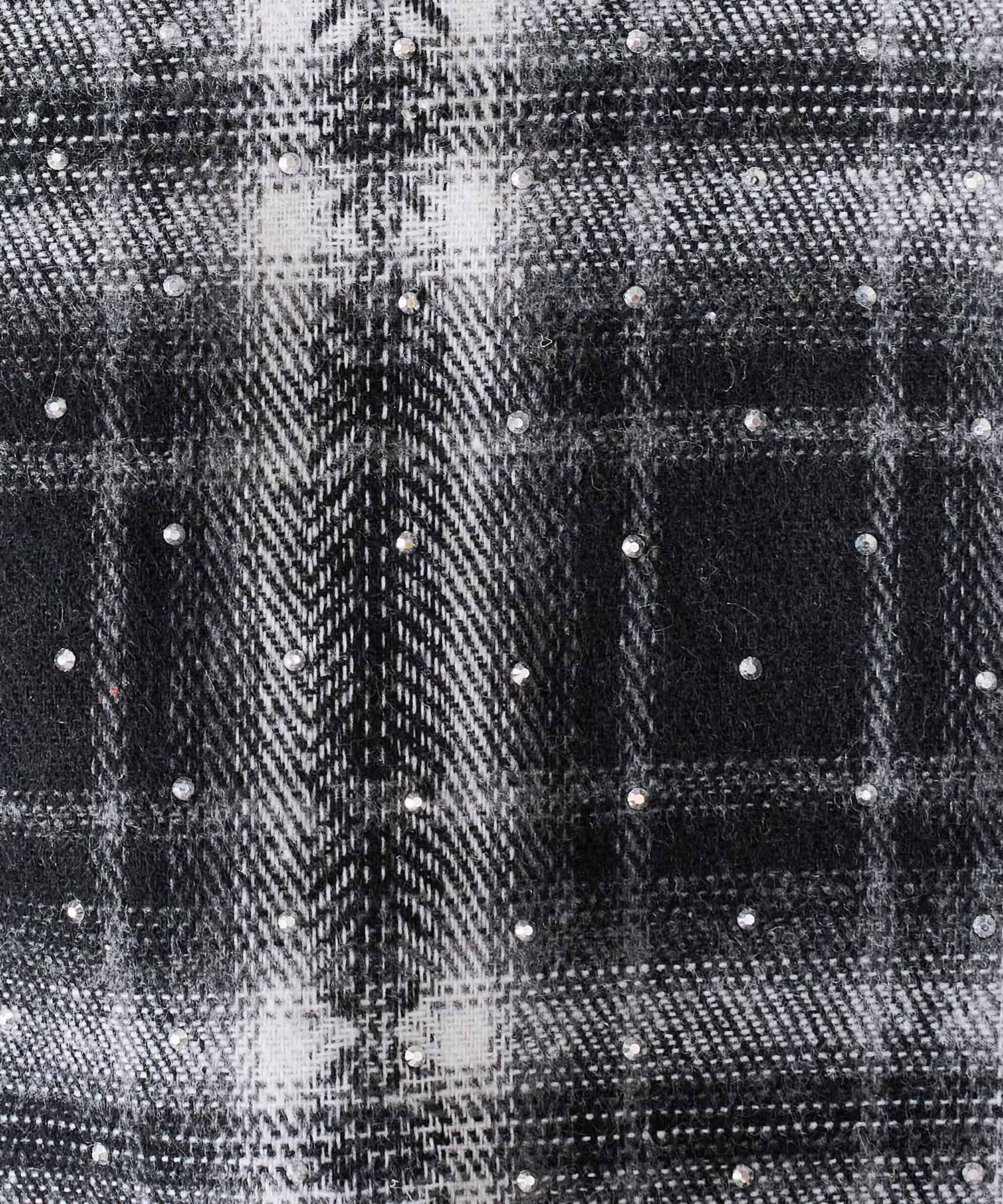 ボディ全体に散りばめたラインストーンはキラキラ光って、カジュアルなのにエレガントさを感じるデザイン。ジュエリー調の釦が上品さを更にアップさせている。