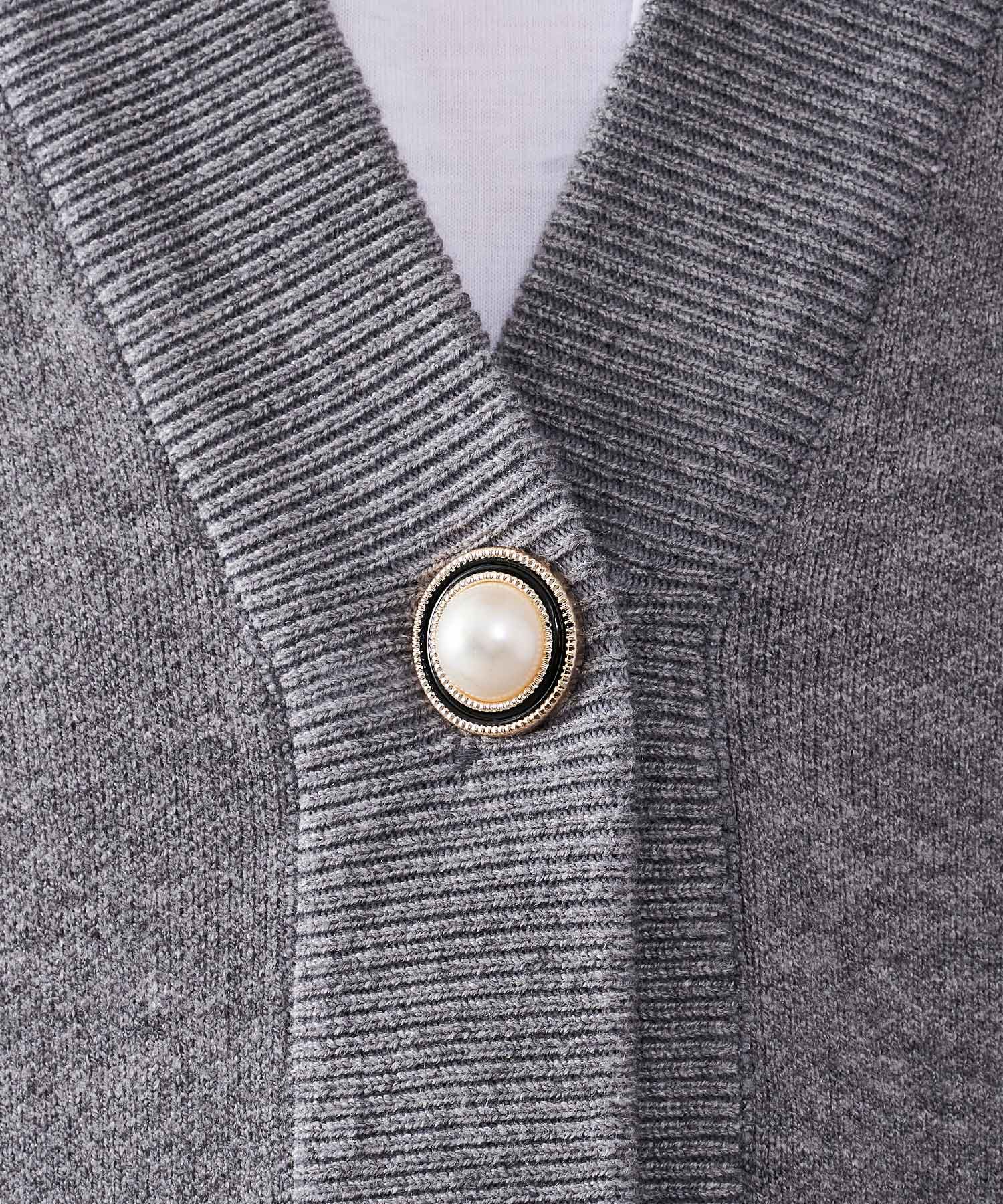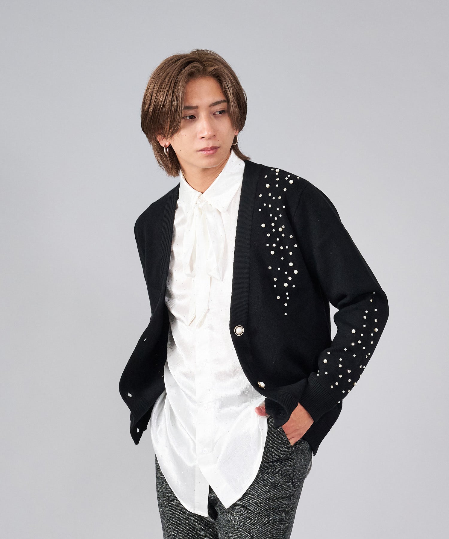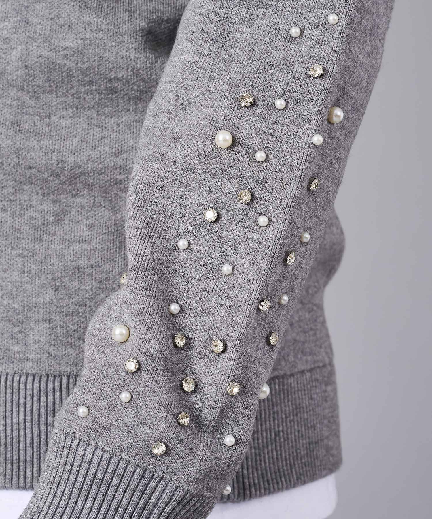 肩と腰にアシンメトリーに配置したジュエリー調のアクセが目を引くデザイン。パールとスワロフスキーの様な飾りを散りばめ、ボタンも大きめのパールの様なデザインを採用。