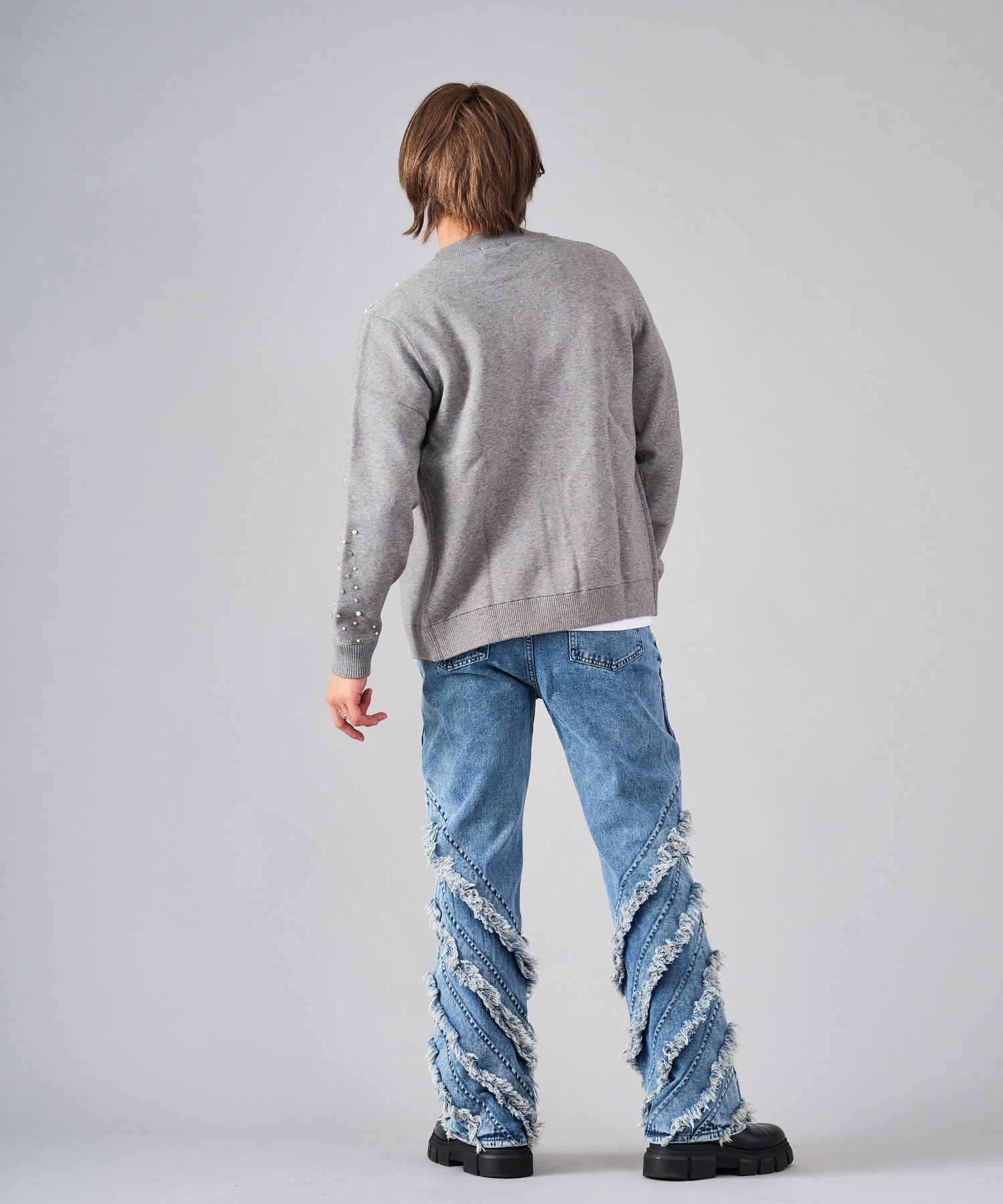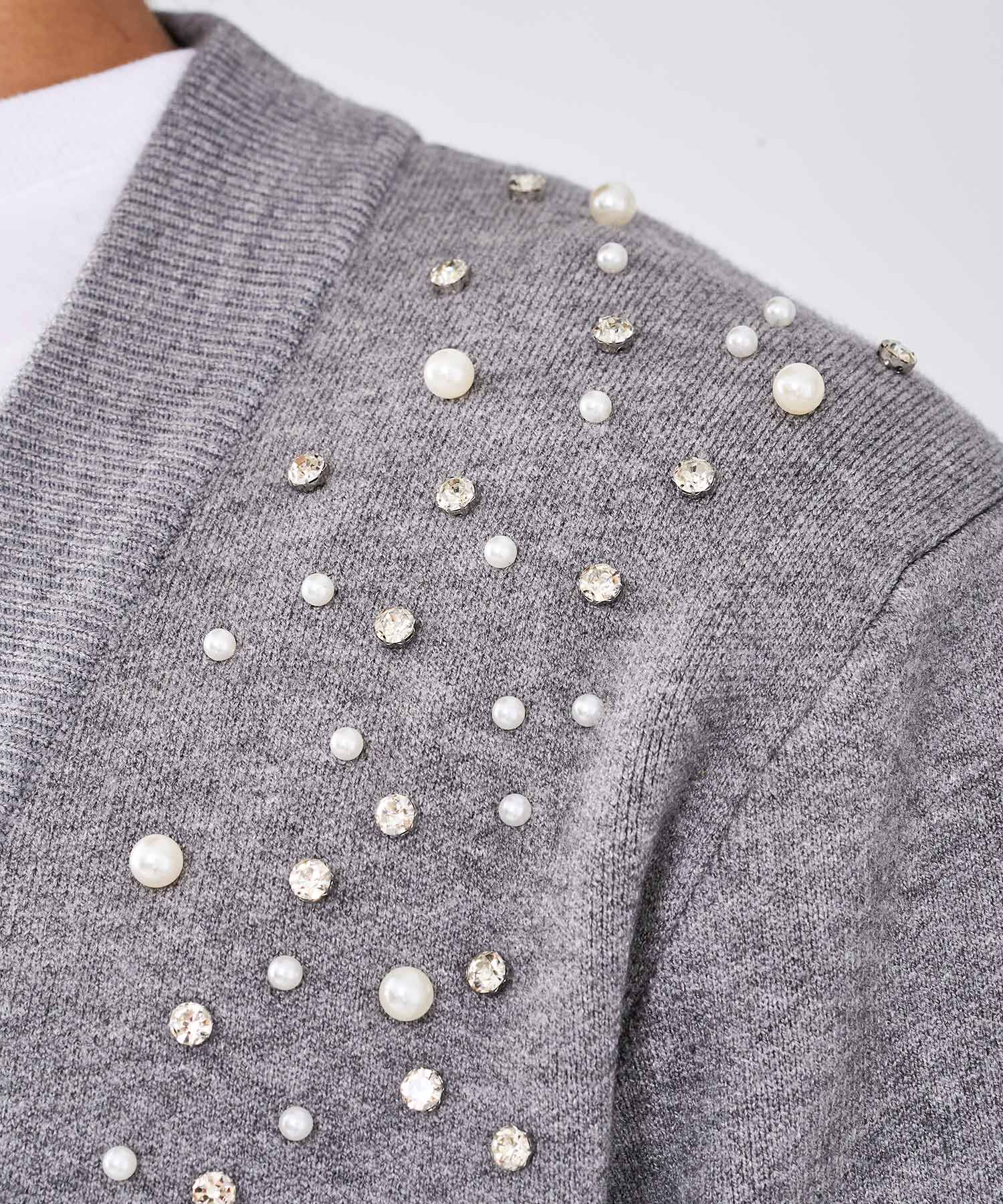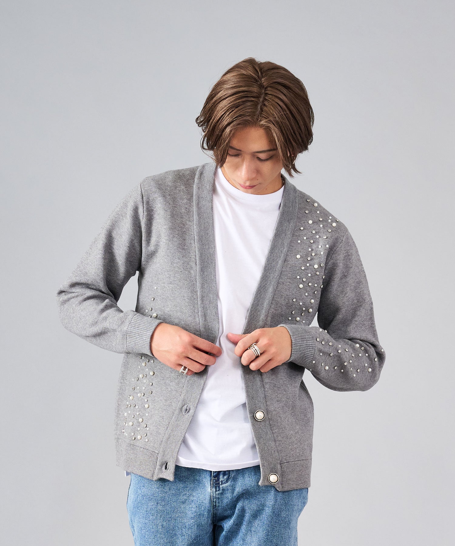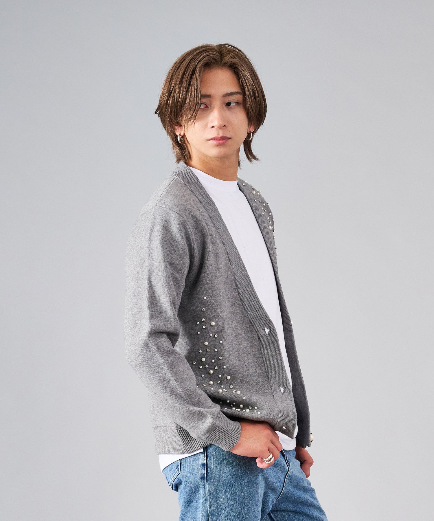 肩と腰にアシンメトリーに配置したジュエリー調のアクセが目を引くデザイン。パールとスワロフスキーの様な飾りを散りばめ、ボタンも大きめのパールの様なデザインを採用。