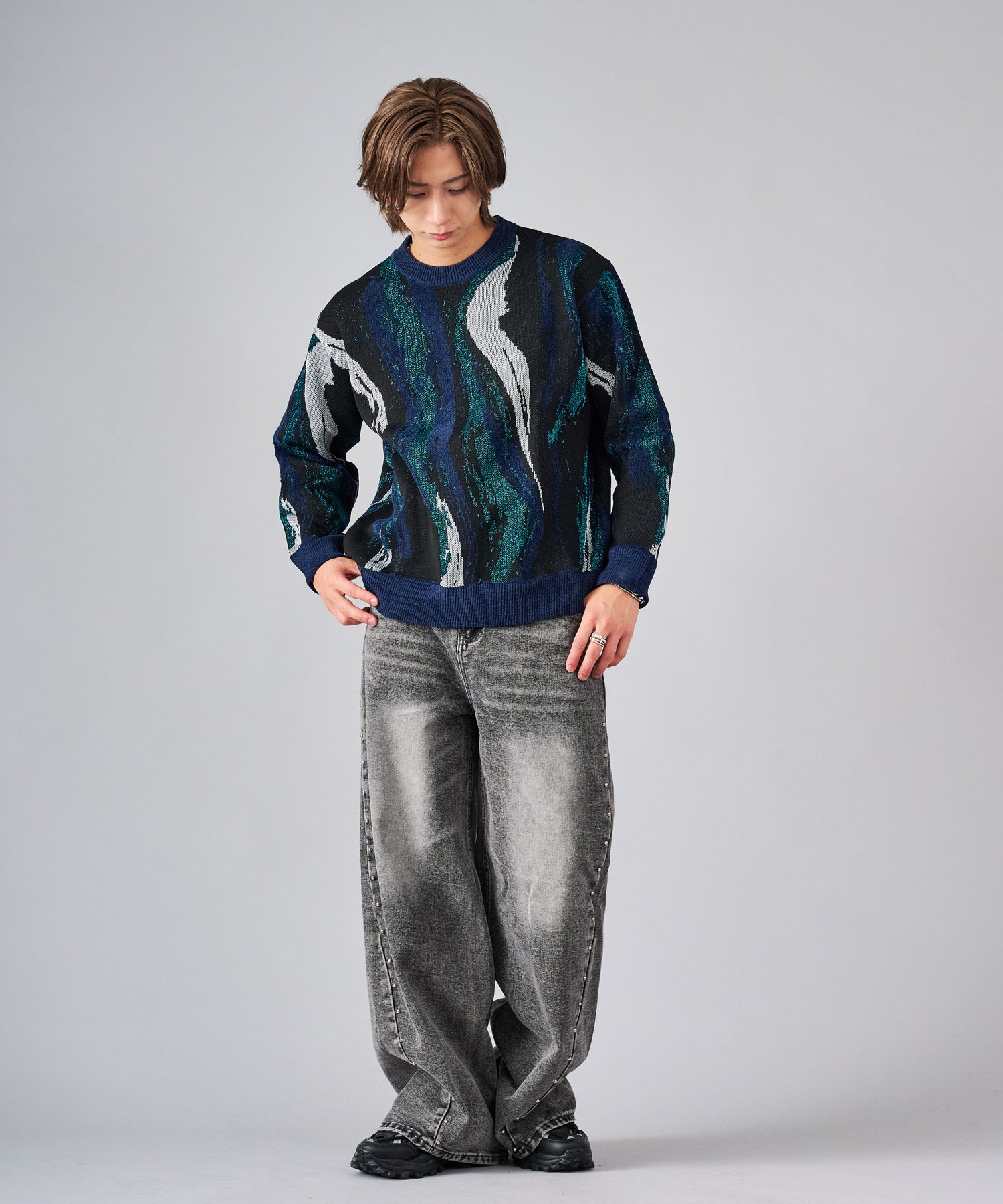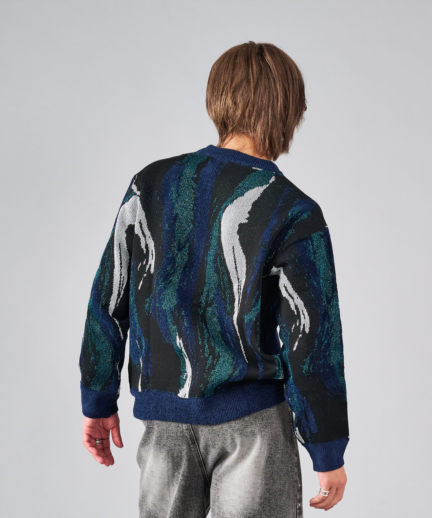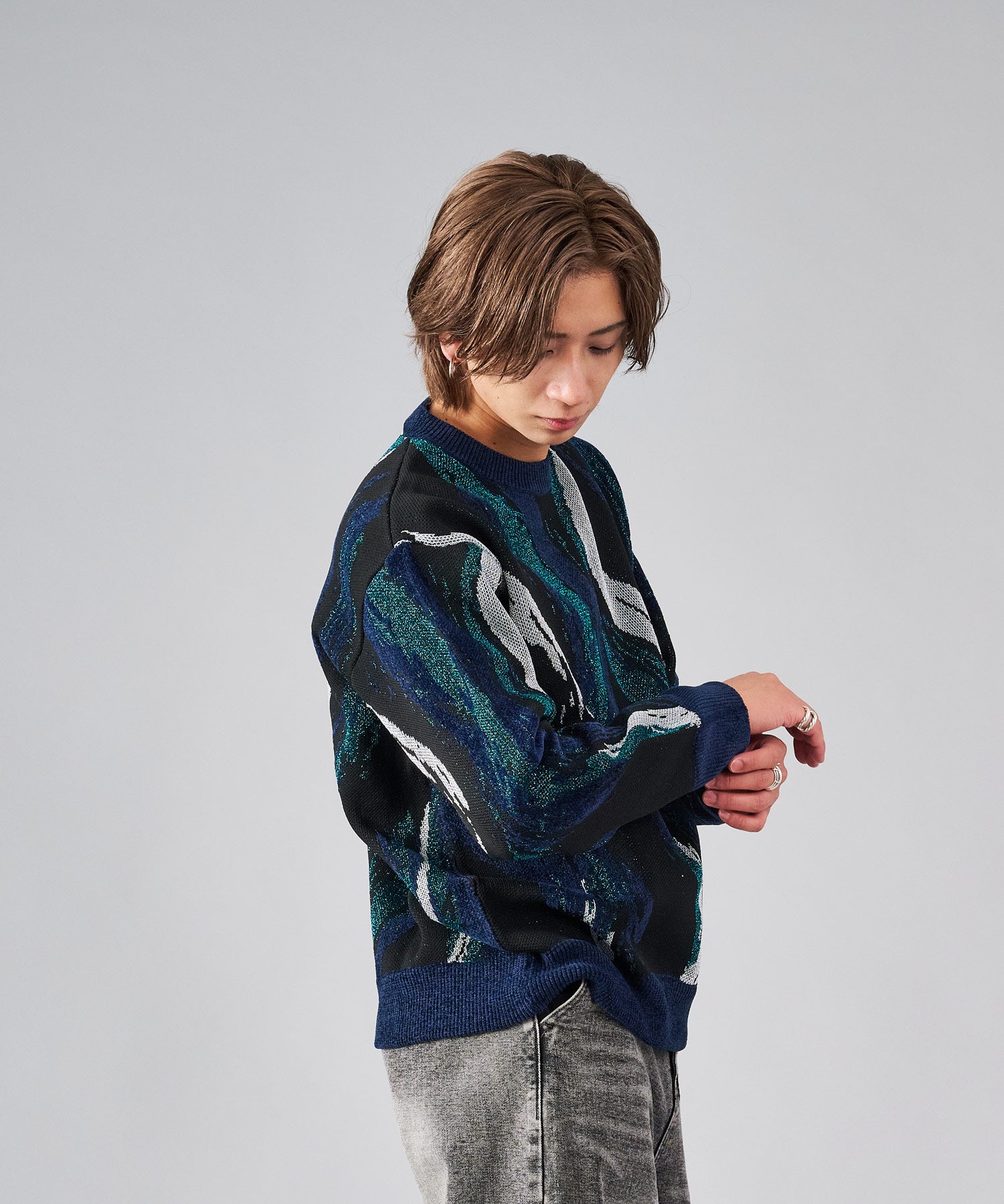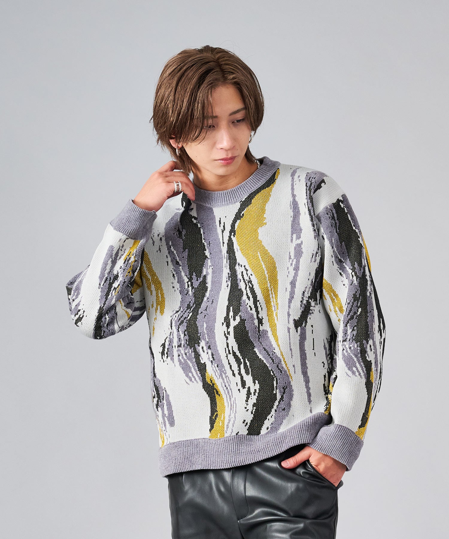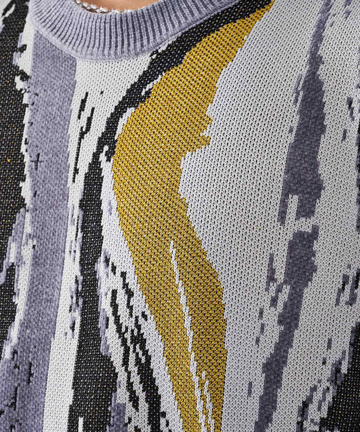 存在感のある流線的なジャガード柄が新鮮なニット。ラメ糸を使用したシャイニーな仕上がりは、一層目を引きます。