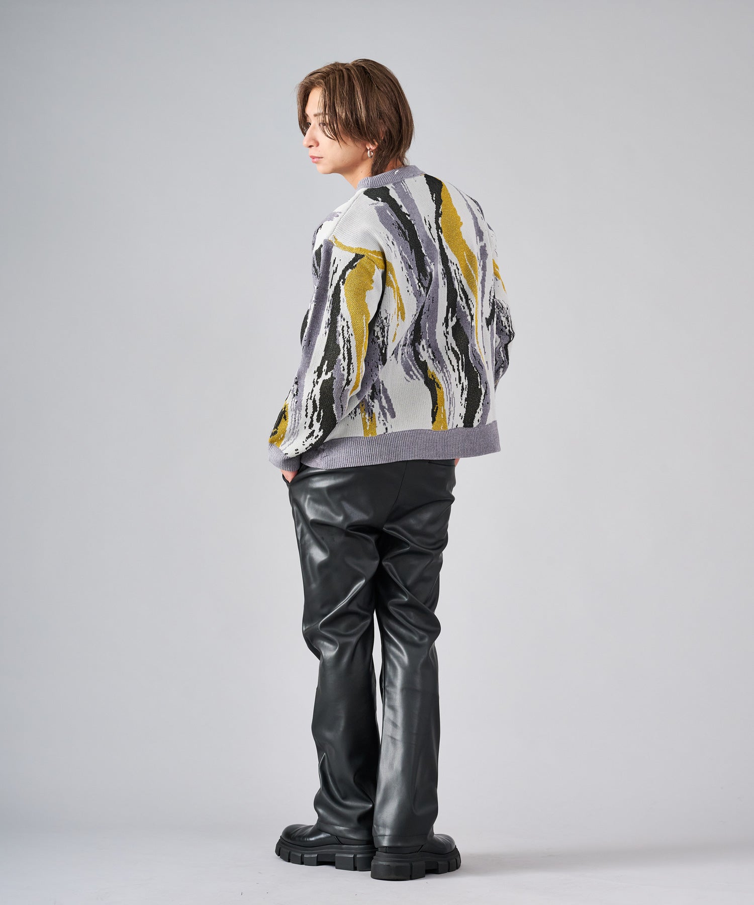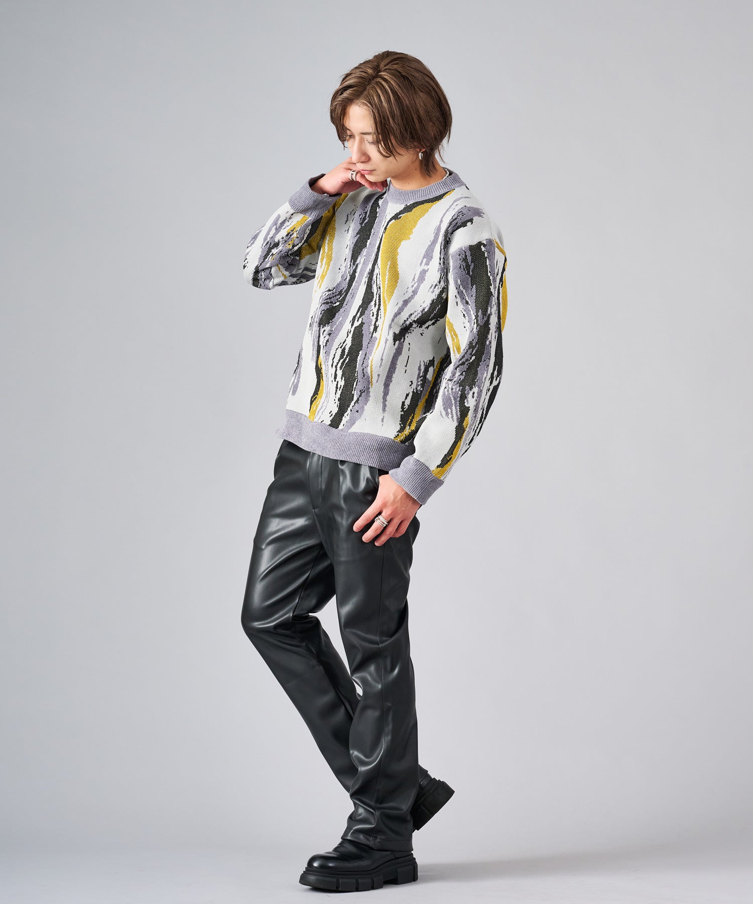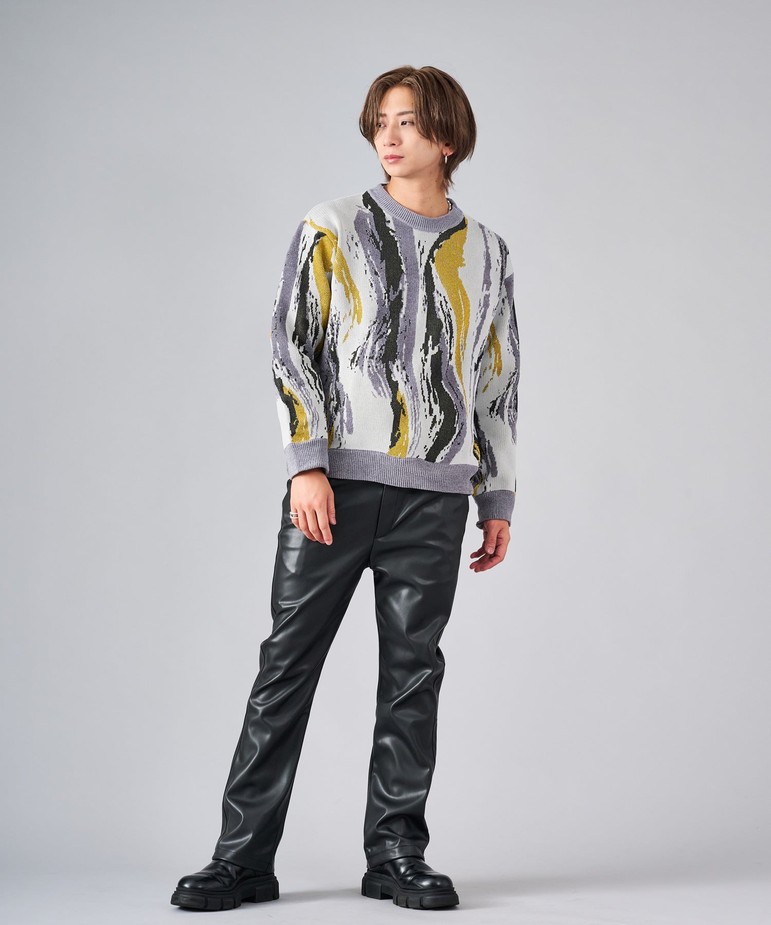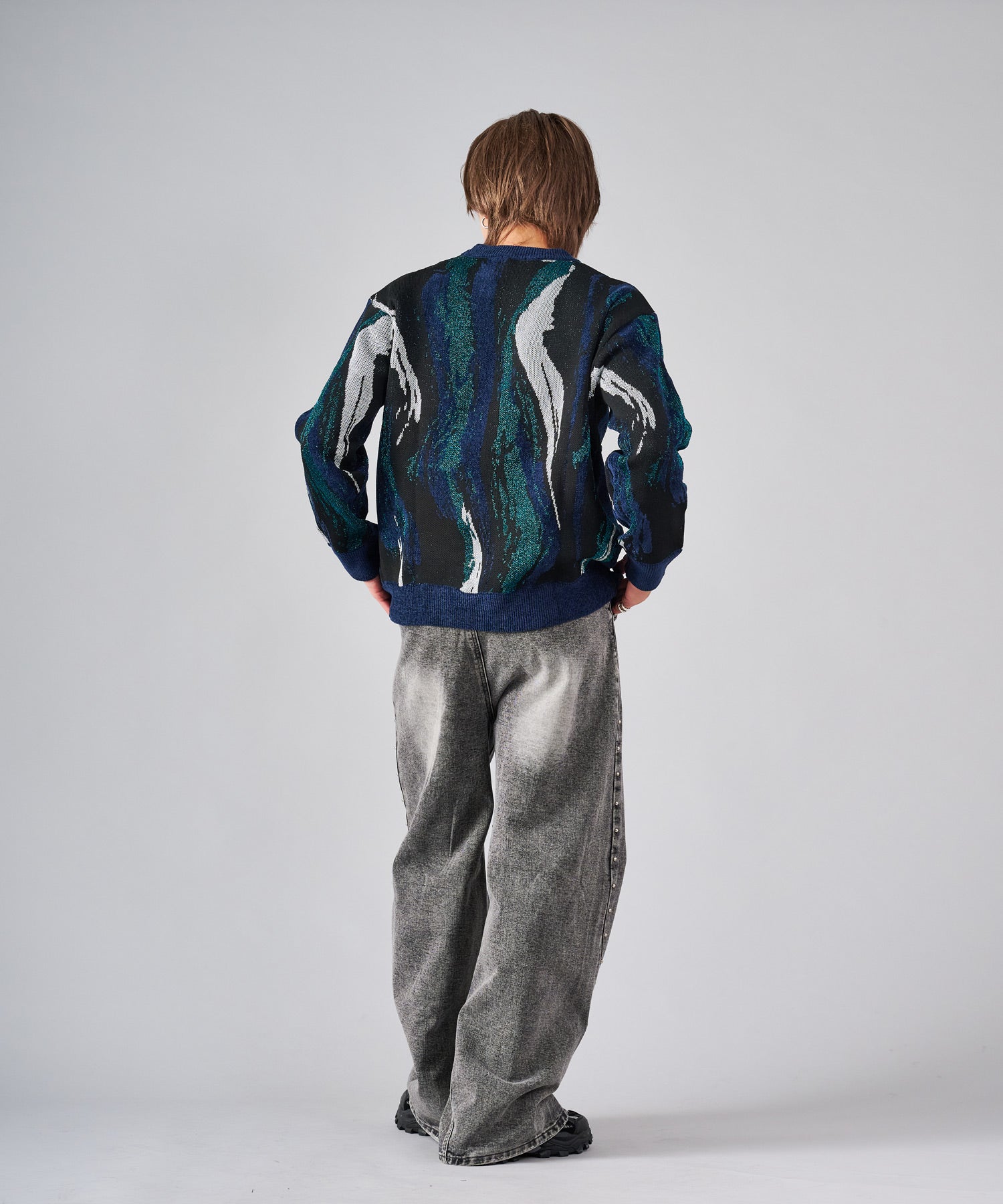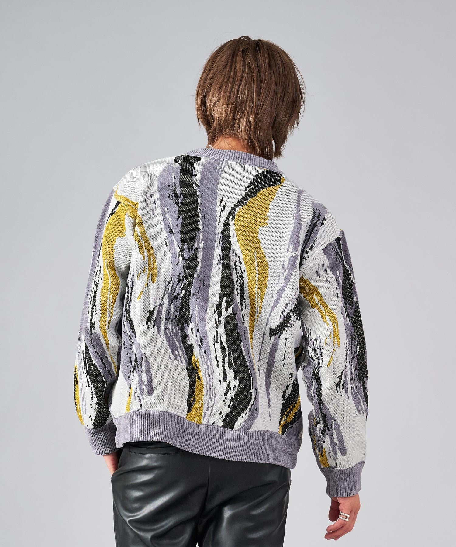 存在感のある流線的なジャガード柄が新鮮なニット。ラメ糸を使用したシャイニーな仕上がりは、一層目を引きます。