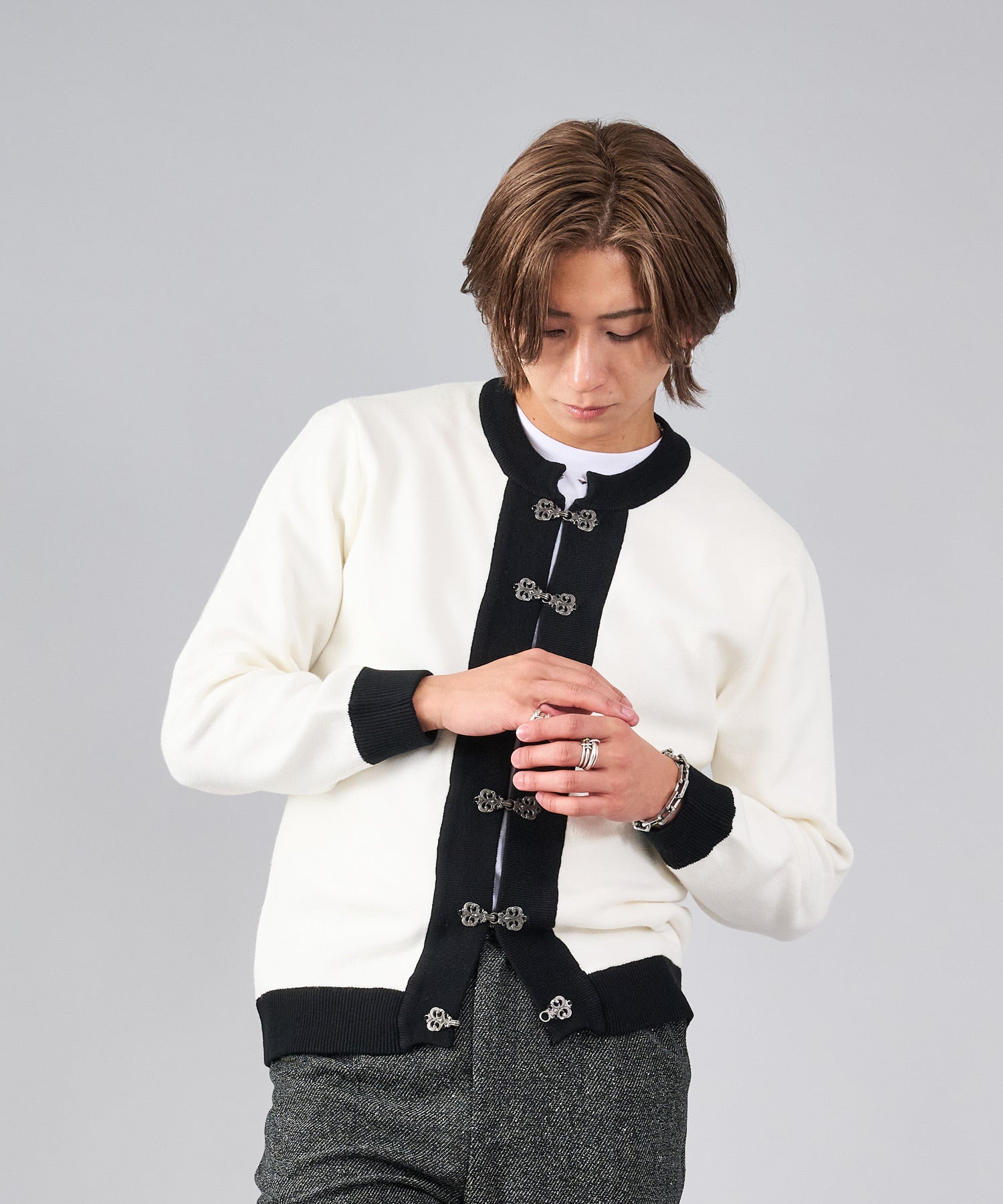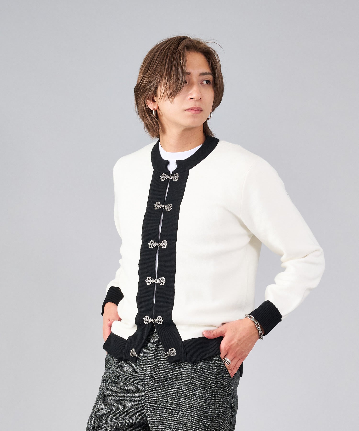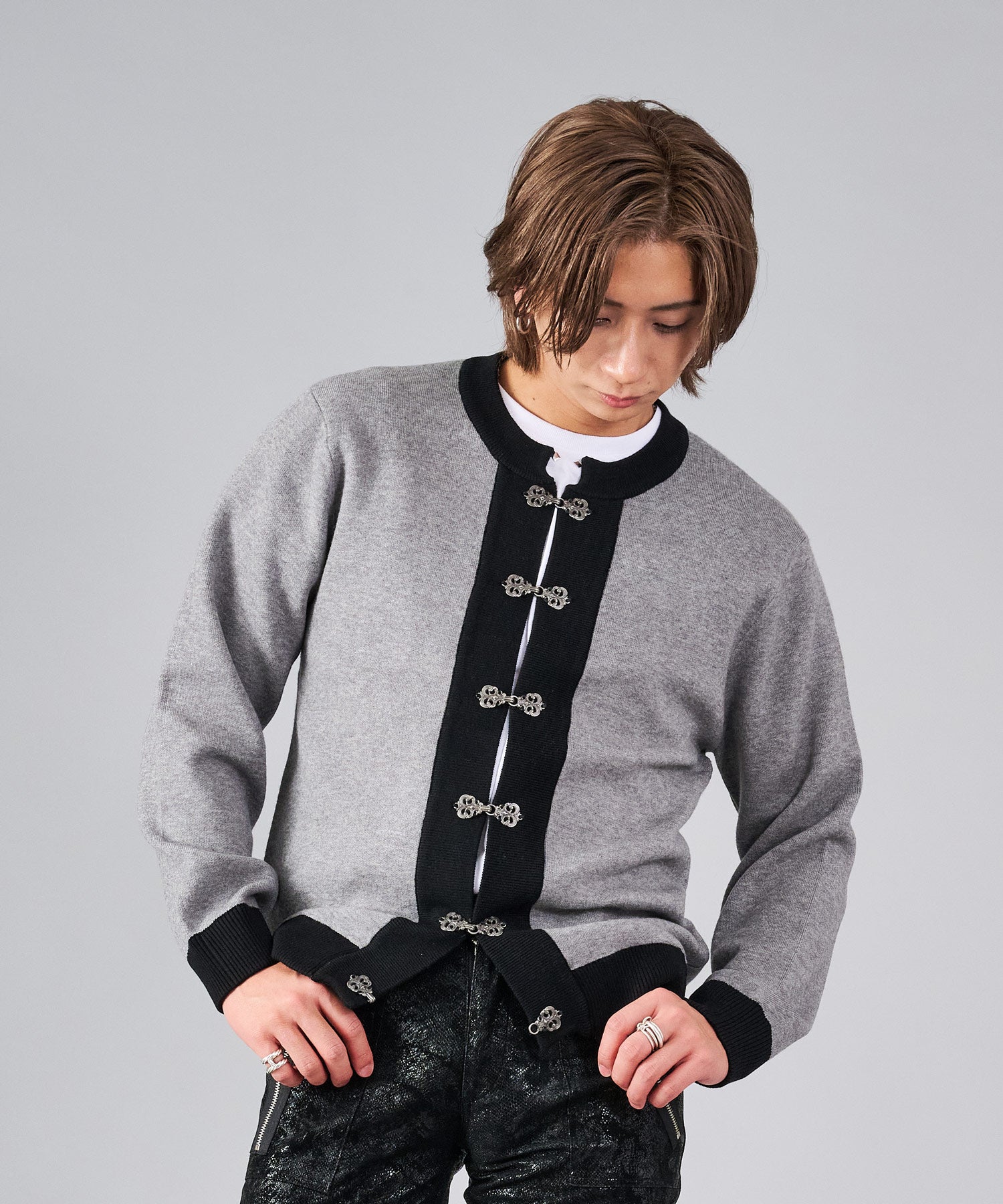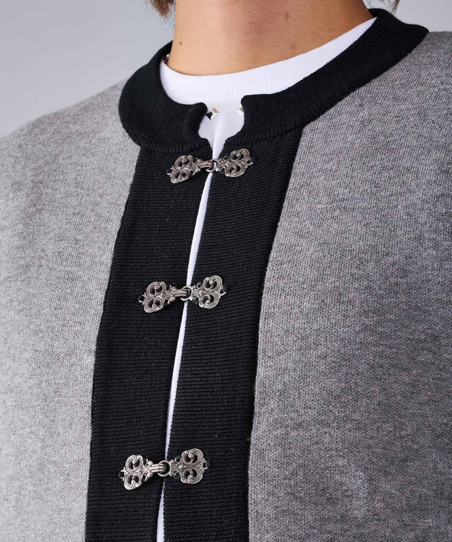 フロントのフック釦がアクセントのカーディガン。チャイナ釦の様なデザインをメタル調にすることで男性らしいアレンジを効かせたアイテムです。