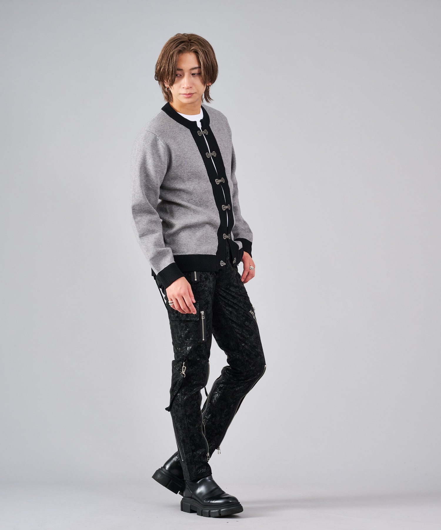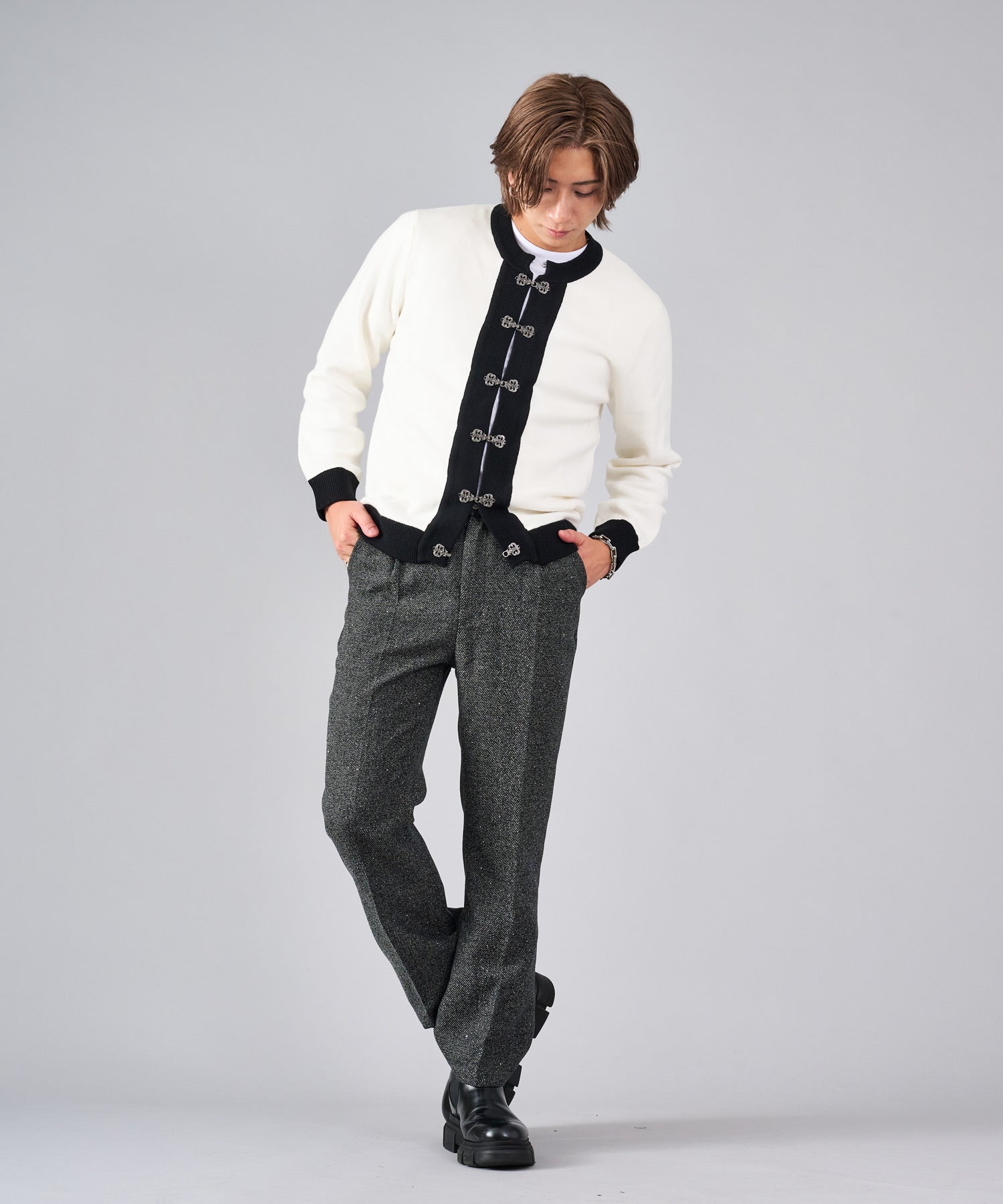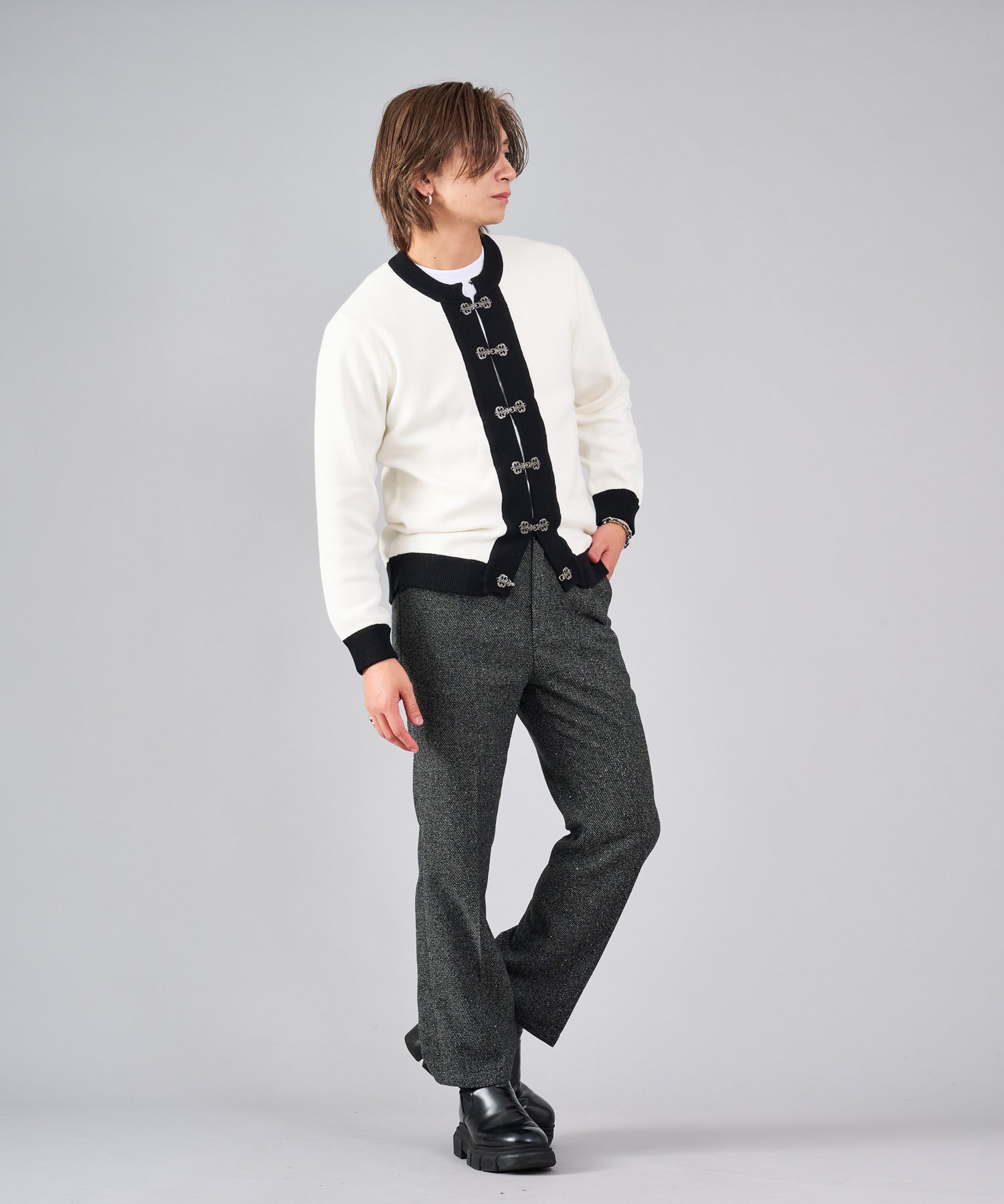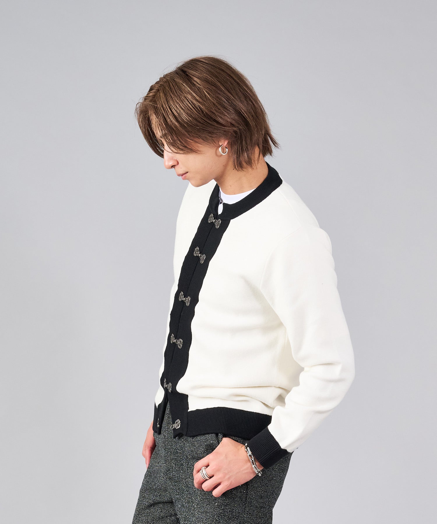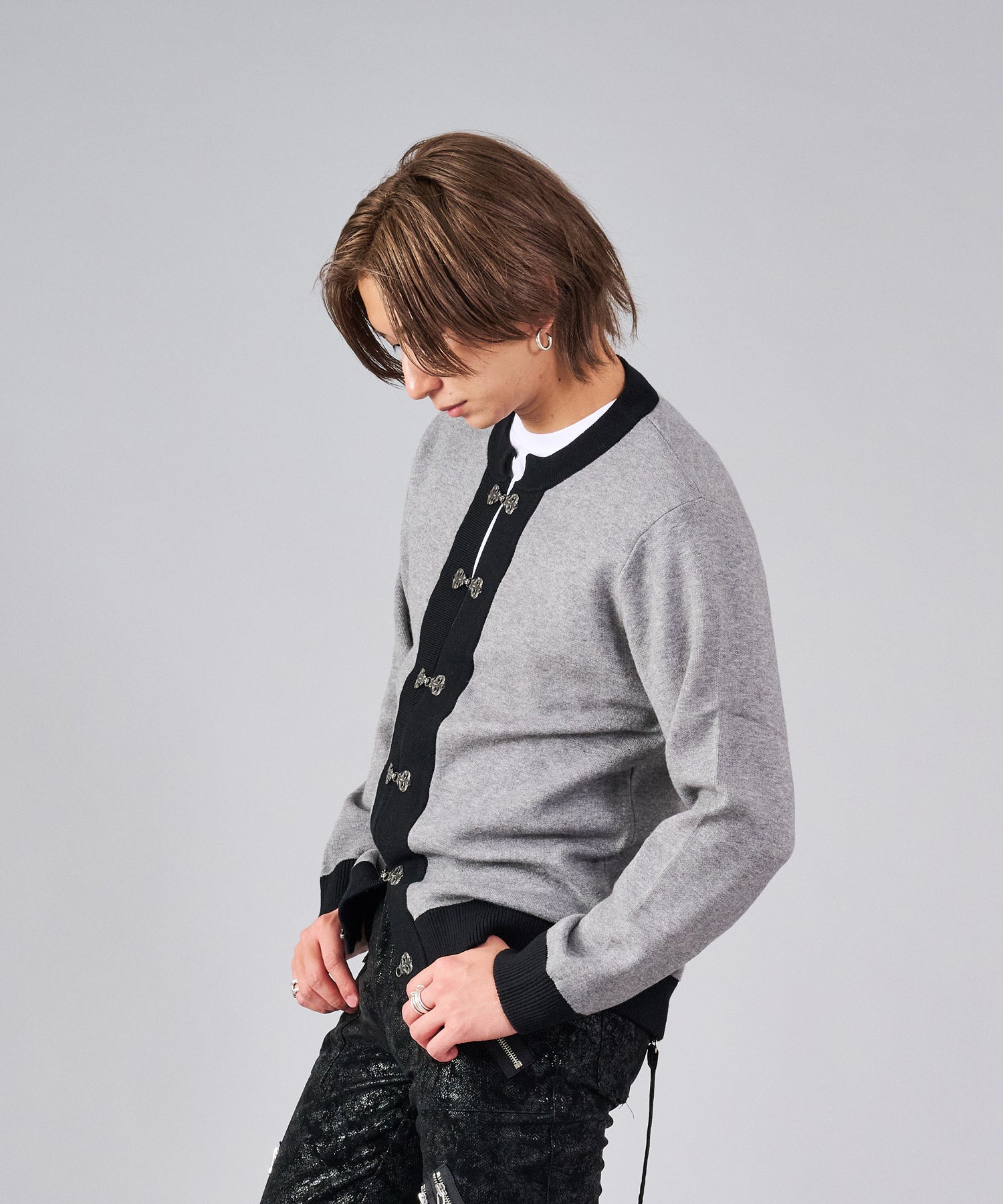 フロントのフック釦がアクセントのカーディガン。チャイナ釦の様なデザインをメタル調にすることで男性らしいアレンジを効かせたアイテムです。