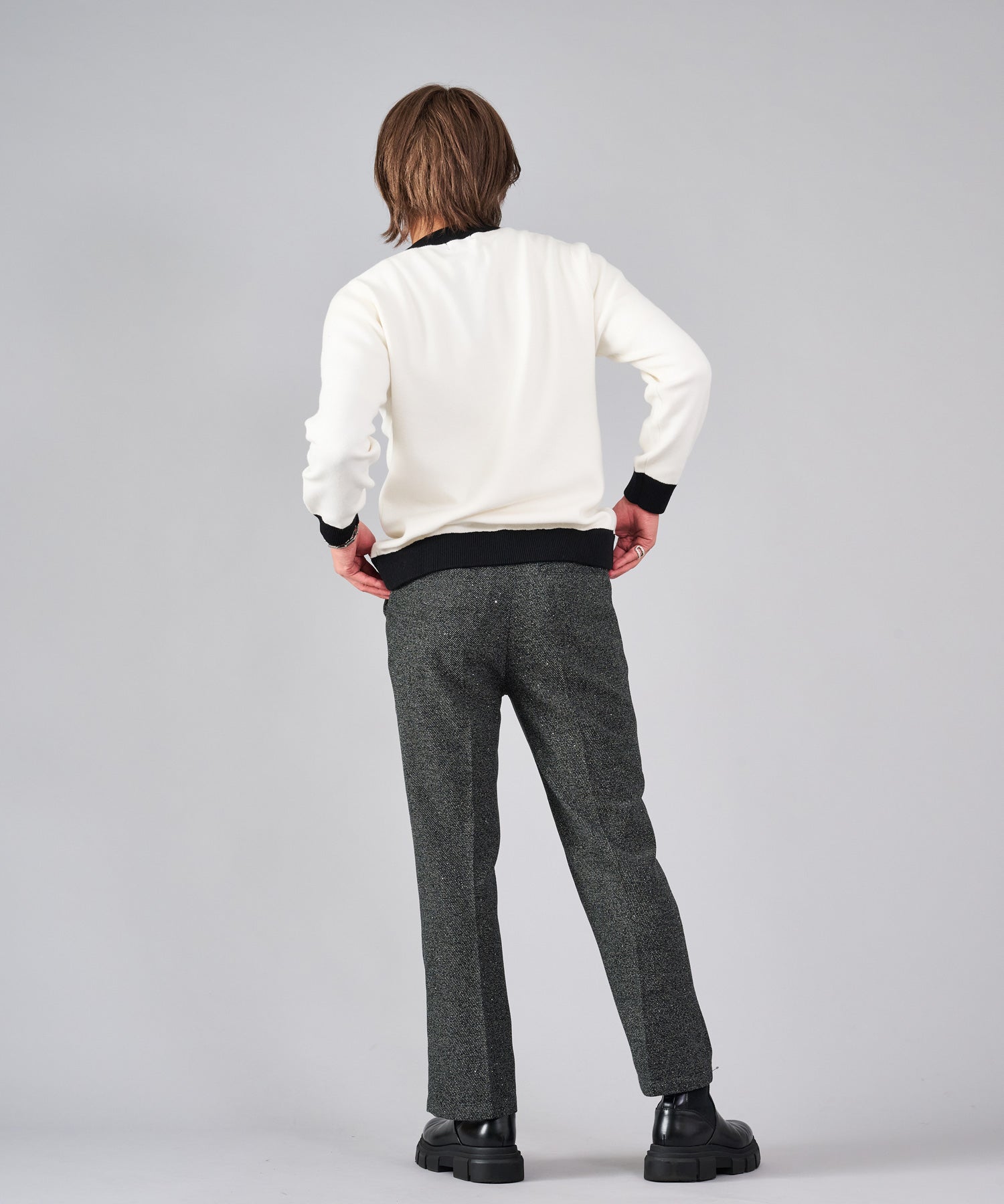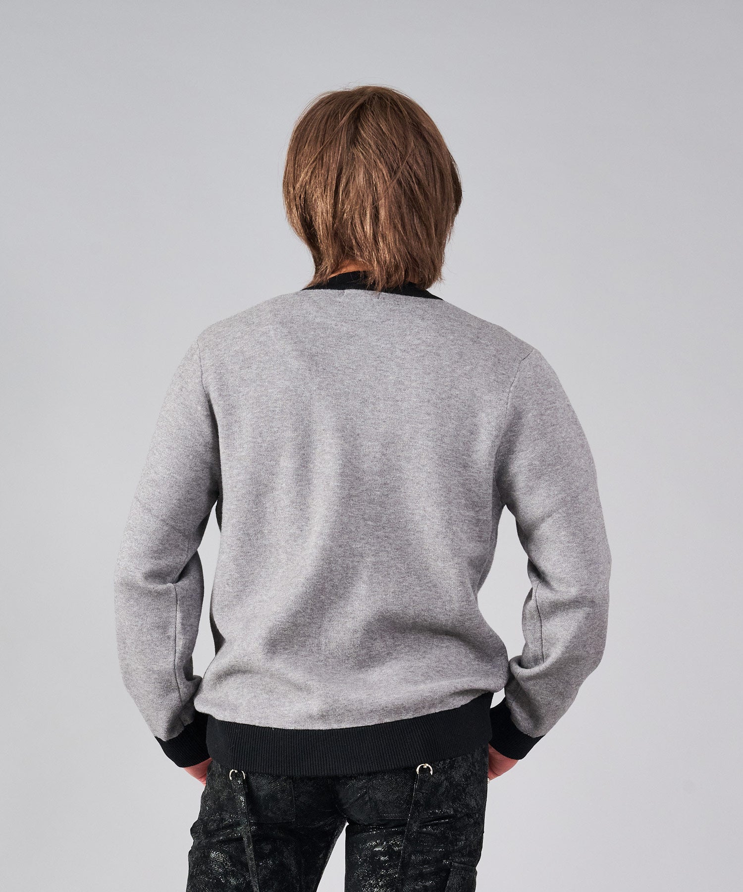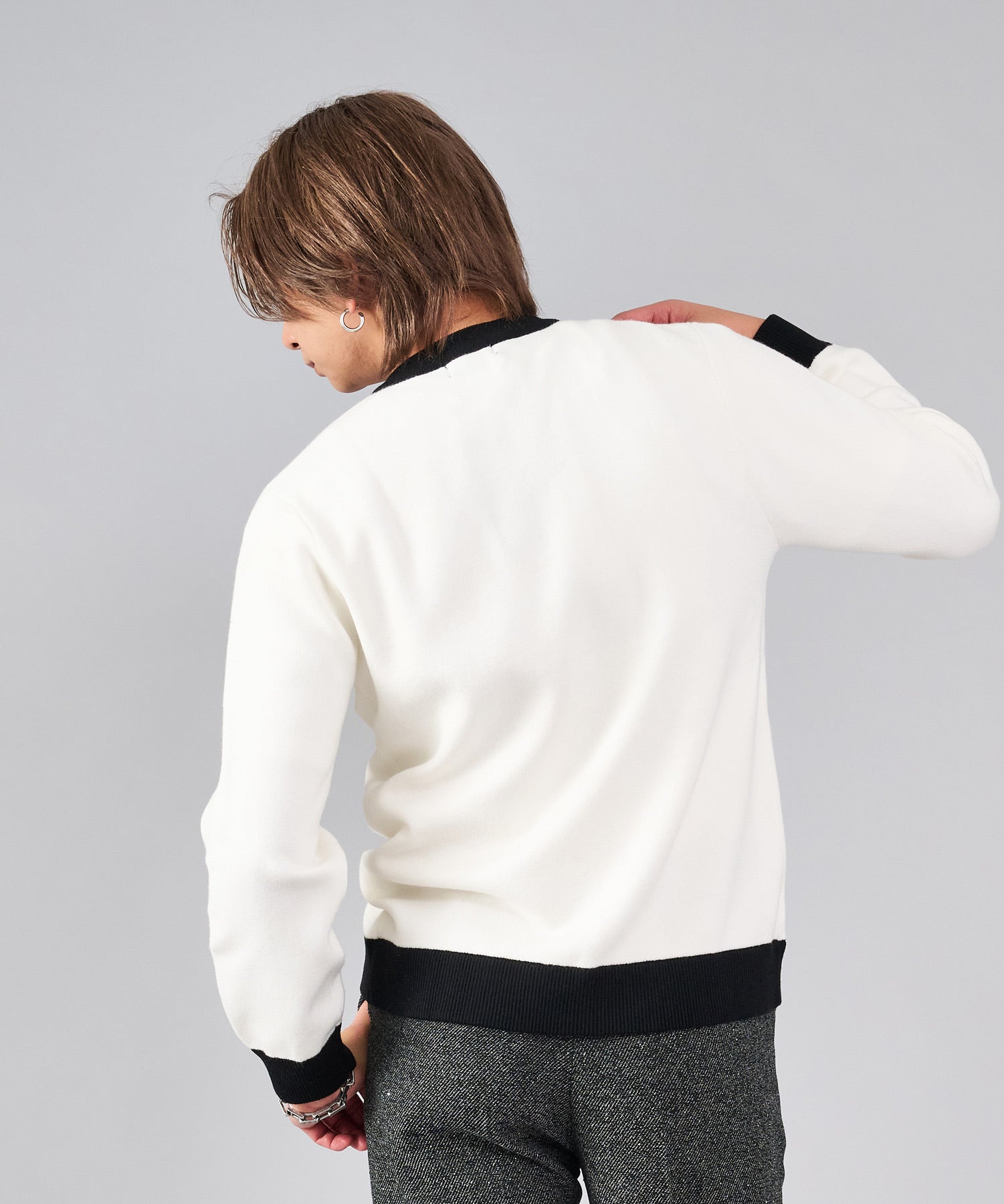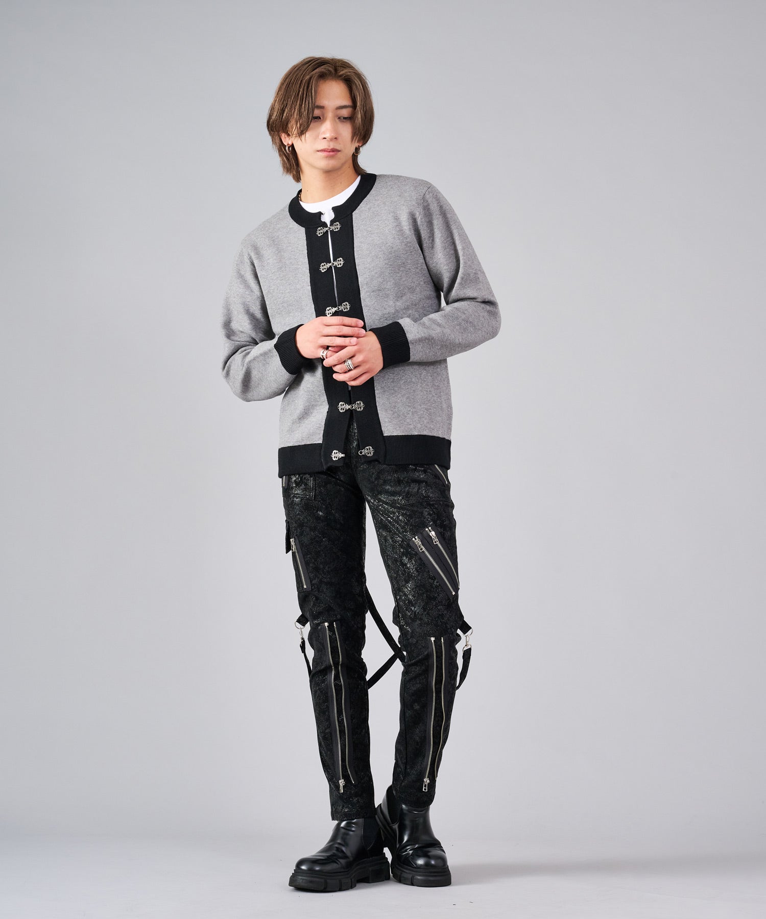 フロントのフック釦がアクセントのカーディガン。チャイナ釦の様なデザインをメタル調にすることで男性らしいアレンジを効かせたアイテムです。