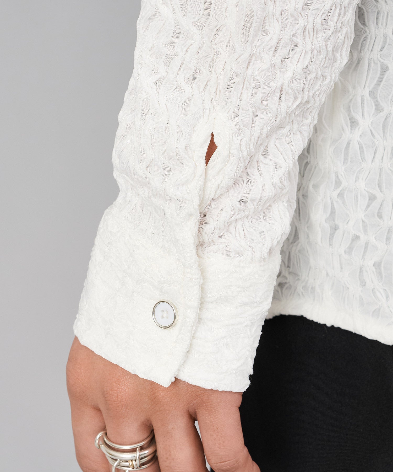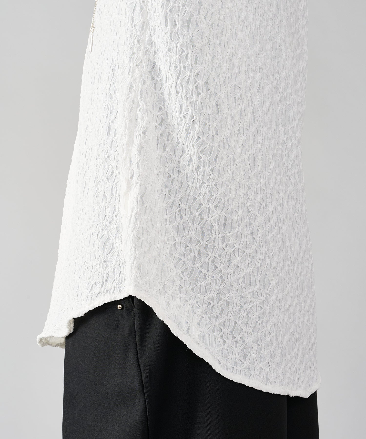 ハイストレッチのリップル生地は、表面の凹凸感が柄の様に表現され、その伸縮性はストレスない着心地でリラックスできる